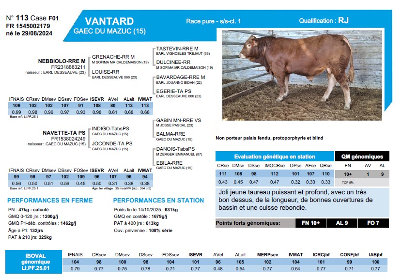 Note d'état attribuée lors du pointage ET 6Dessus d'épaule DE 8 Largeur du dos LD 8 Arrondi de culotte AC 8 Largeur de culotte LC 8 Longueur de culotte LC 8 Epaisseur du dessus EpD 9 Développement musculaire DM 83Longueur du dessus LD 7 Longueur du bassin LB 7 Largeur aux hanches LH 8 Développement Dév 6 Développement squelettique DS 68Largeur du muffle DN 9 Aplombs avant AAv 7 Aplombs arrière AAr 7 Rectitude du dessus RD 9 Aptitude fonctionnelle AF 80Profondeur de poitrine PP 8 Largeur de poitrine LP 8 Largeur aux trochanters LT 8 Grosseur des canons GC 3